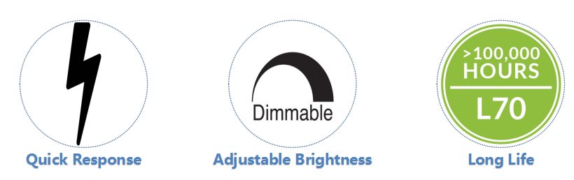 快速啟動(dòng):傳統(tǒng)的高壓鈉燈和鹵素?zé)舻膯?dòng)達(dá)到100%亮度需要十多分鐘,而LED產(chǎn)品啟動(dòng)瞬間就能達(dá)到100%亮度,反應(yīng)時(shí)間也是毫秒級(jí)別。