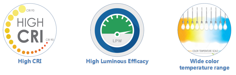 3、LED的光性能:顯色指數(shù)高、超高的光效、超寬的色溫范圍